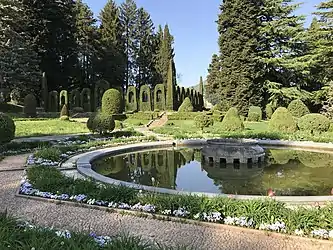 Two different gardening styles compose the main Villa Toeplitz's Gardens: a "specifically formal"[11] Giardino all'italiana, characterized by low boxwood bushes and cypress trees; and an English landscape garden, with beech trees, oaks and cedar trees. A part of the park is currently occupied by a large chestnut wood, penetrated by tracks leading to a "deep nature contacting experience".[11] The park also contains a series of fountains, waterfalls and symmetrical topiary architectures, that characterize the early origins of the garden. A natural pathway runs through a chestnut wood in the northern part of the gardens immediately behind the villa,[8] from the southern entrance of the gardens to the northern one. It is composed of "sinuous and romantic" alleys that are interrupted by small hills and "elegant" iron gazebos.[8] At the end of the promenade, a children's playground and a bocce field has been installed by the Administration of the City of Varese.[8] On 21 December 1972, the Toeplitz Gardens, as well as the Villa, were acquired by the administration of the City of Varese.[11]
