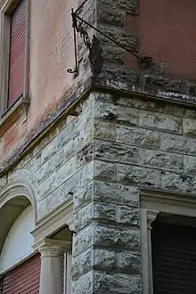 The location of the villa provides extensive views of the Valceresio, the Olona Valley, the Mendrisiotto and part of the Comasco.[11] The building has an eclectic architectural style, created by a mix of construction materials and approaches. These include the Lombard style of reusing existing materials, the 19th-century traditions of the architect Camillo Boito, and the use of Renaissance models that recall classical and mannerist art. Brick masonry is embedded in terracotta, and ashlar used on the ground floor. The grey stone that adorns the lower part of the building was obtained from the limestone quarries above nearby Barasso.[12]
