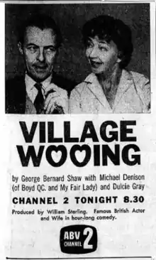Village Wooing is a 1962 Australian television play directed by William Sterling and starring Michael Denison and Dulcie Gray who were touring Australia at the time. It was based on the play by George Bernard Shaw.[3][4]