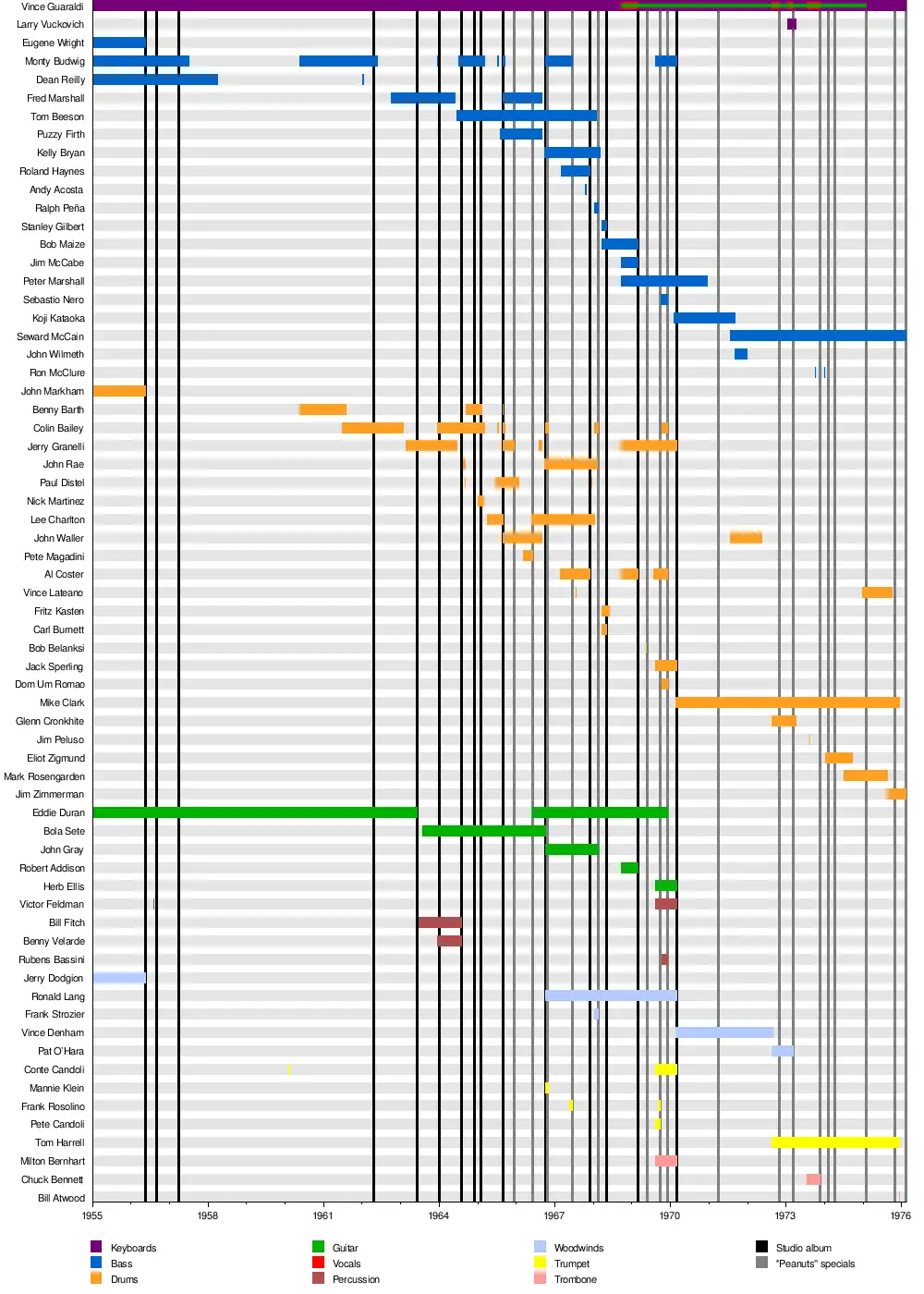 For bass/double bass, regular sidemen during the 1950s and 1960s included Monty Budwig, Dean Reilly, Fred Marshall and Tom Beeson. During the 1970s, Guaraldi performed with Koji Kataoka and primarily Seward McCain.[18]