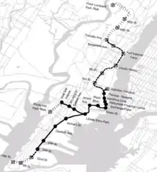 - Chen, David W. (September 10, 1995). "NEWS AND TOPICS: ROAD AND RAIL; On the Waterfront, a 20-Mile Trolley Chugs Closer to Reality". The New York Times.