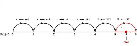See the corresponding diagram where the root lies in the interval (5, 6). It can be easily inferred that, if the root is far away from the origin, it takes a lot of time to find its integer part this way, hence the exponential nature of Vincent's method. Below there is an explanation of how this drawback is overcome.