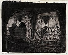 After ten years working in local pits, Evans attended Swansea School of Art. By 1919 Evans had had a picture exhibited at the Royal Academy and his painting Toilers Underground had been bought by the Miners' Federation of Great Britain for £60.[4] In 1920 he won a scholarship to the Royal College of Art, RCA, where he studied under William Rothenstein and Frank Short until 1922.[1][5]