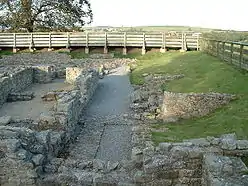 A long-term program of excavation begun by the Bowes Museum for Durham County Council ran from 1976–1980, and then again from 1986–1988. It focused primarily upon the baths suite and the attached commandant's house, uncovering several phases of activity.[14] The first was the construction of the original courtyard house presumably used by the commandant of the fort, built sometime after the middle of the 4th century atop two previous smaller stone buildings, also presumably praetoria. It had attractive decor and was meant for a single occupant. Later, but also perhaps in the 4th century, a detached bath suite was built adjoining the house, necessitating the demolition of part of the earlier building. It had three rooms: a warm room, a hot room, and a hot room with two plunge baths. The excavators understood this bath building to be for the use of the commandant only. Still later, the house seems to have lost its singular occupant. Rooms were subdivided and several self-contained units were created in what was originally a large house. The baths received a flagstone court, a triple-arched gateway, and a small anteroom, and it is suggested that the reorganisation of both structures meant the baths were opened to the entire regiment at the fort. A coin of the usurper Magnentius, minted between 350 and 360, may provide a terminus post quem for these renovations. The baths and house then fell on rough times. Lack of maintenance of the baths can be seen archaeologically in the next period, and in the house, the rooms come to be used for industry, including blacksmithing, lime slaking, and animal butchery. A midden dug in a channel around most of the building held a great deal of animal bones and debris. Finally, the collapse of a few walls and part of the roof of the baths seems to have heralded the end for the complex some time in the post-Roman period. However, the entire fort seems to have been used as a cemetery from the mid-6th to the 11th centuries. A Saxon woman was found buried in the rubble caused by the roof collapse.