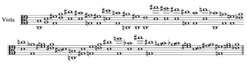 To indicate microtones, Ligeti uses the sonata three downward arrows for alterations of -49, -31 and -14 cents, respectively. The use of microtonal intervals is common in the works of Ligeti. In the Viola Sonata, their use follows the harmonic Scale on F. In this way, the harmonic construction, with -49 cents lower on B♮, -31 cents lower on E♭, and -14 cents lower on the A♮, the ear suggests the resonance of the imaginary "fifth" string F, which would lie a fifth below the viola's lowest C, which makes the movement in some aspects similar to spectral music.[6]