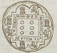 At this time, as noted by the heraldist Faustino Menéndez Pidal de Navascués, Violante used a personal seal in whose center appeared the coat of arms of her husband, six roundels of the House of Castro, surrounded by eight castles and lions placed on the outer lobes, perhaps due to her condition of being the illegitimate daughter of King Sancho IV.[50] In the mentioned seal, which was drawn in the 17th century by the genealogist and historian Luis de Salazar y Castro in his work Pruebas de la Historia de la Casa de Lara, also appeared the legend «+ S. DOÑA VIOLANTE FIJA DEL REY DON SANCHO».[51]