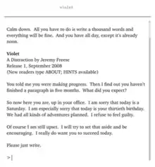 The protagonist of Violet is a graduate student trying to write 1,000 words for his dissertation.[2] The protagonist's girlfriend, Violet, threatens to leave otherwise.[2][3] The protagonist faces a stream of distractions,[2] including a window with a view of the campus, and a computer with access to blogs and webcomics.[3] In the course of the game, the protagonist must "reconsider—and risk wrecking—" his career and relationship.[2]