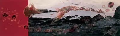 Viral Landscapes is a series of artworks created in 1989 by the British artist Helen Chadwick.[1] The series consists of five photographs, each three metres (9.8 ft) wide of different landscapes of the Pembrokeshire coast in Wales, overlaid with fragments of cellular imagery. Chadwick had taken samples of cells from her cervix, vagina, ear and mouth and overlaid the images of her body matter with patterns created by pouring paint onto the sea and dragging a canvas through the waves through computer imaging technology.[2]