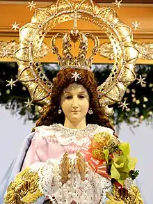 | Attributes | The Blessed Virgin Mary encrusted with jewels, golden crown, aureole and moon. |