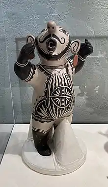 Virgil Ortiz (born 1969) is a Pueblo artist, known for his pottery and fashion design from Cochiti Pueblo, New Mexico. Ortiz makes a variety of pottery, including traditional Cochiti figurative pottery, experimental figurative pottery, traditional pottery vessels. His clothing and jewelry designs are influenced by traditional Native American pattern and aesthetics. He is best known for his edgy pottery figures, his contemporary take on the traditional Cochiti pottery figures (monos) from the late 1800s.