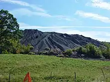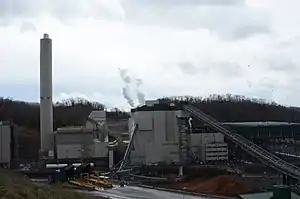 The cost for construction was around $1.8 billion USD, and the plant uses diverse fuel sources to produce energy, (making it unique compared to other energy plants).[3] This generation facility uses coal as well as waste coal (which are called gob piles) in order to produce energy.[4] Biomass can also be used for up to 20% of the fuel burned in the plant to create energy; as of November 2019, biomass accounted for 7% of input fuel.[5] The plant had some challenges during construction which had to be overcome. It was difficult for the builders of the plant to find places where the coal and wood could be stored because the plant was built in a mountainous region. The mountains did not allow for much expansion, so they decided to build the coal storage areas higher than the plant so that gravity would allow the coal to work its way down to the plant to be burned for energy.[6] During February 2012, very close to the end of construction, there was a fire on the roof of the building that contained the boilers. It damaged many circuits and part of the roof, but was only a minor setback for the construction of the plant and the schedule was only delayed by one week.[6] The Virginia City Hybrid Energy Plant has an excellent track record for safety. It was discovered that in 5 million hours of working the plant, there were no accidents that resulted in a loss of time.[7] The plant began generating electric power in July 2012, and has provided jobs around the area of St. Paul, Virginia.[8]