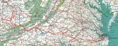 The passenger trains in the system's final decade, the 1950s, consisted of separate runs from Page, West Virginia to Roanoke; and then between August, 1952 and July, 1955, from Roanoke to Norfolk.[6][7] The last remaining passenger service on the line was discontinued by 1956.[8] The latter route was on a more southerly and more rural itinerary than mainline of the Virginian's major competitor, Norfolk and Western, whose main line went through Lynchburg and Petersburg.[9]