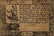 In the United States in 1776, Virtus was made the central figure in the Seal of Virginia and the subsequent state flag, which features the seal. The Virginia four-dollar note, a Continental currency, had a similar Virtus pictured on its obverse.