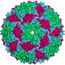 Most animal viruses are icosahedral or near-spherical with chiral icosahedral symmetry. A regular icosahedron is the optimum way of forming a closed shell from identical subunits. The minimum number of capsomeres required for each triangular face is 3, which gives 60 for the icosahedron. Many viruses, such as rotavirus, have more than 60 capsomers and appear spherical but they retain this symmetry. To achieve this, the capsomeres at the apices are surrounded by five other capsomeres and are called pentons. Capsomeres on the triangular faces are surrounded by six others and are called hexons.[57] Hexons are in essence flat and pentons, which form the 12 vertices, are curved. The same protein may act as the subunit of both the pentamers and hexamers or they may be composed of different proteins.[58]