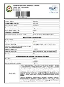 - "Conditions for issuing electronic visas". evisa.gov.az. Retrieved 7 May 2023.