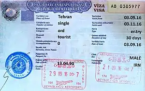 Azerbaijan introduced electronic visas for citizens of designated countries in January 2017. The system is known as ASAN Visa, and visas are issued for a single-entry visit of up to 30 days.[19] Electronic visas should be printed and presented together with the visitor's passport (which must be valid for at least three months beyond the expiry date of the visa) at the border checkpoint.[20]