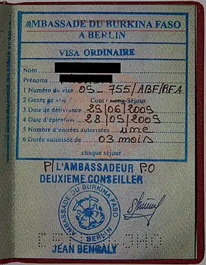 Visitors to Burkina Faso must obtain a visa from one of the Burkina Faso diplomatic missions unless they come from one of the visa exempt countries or a country whose citizens may obtain a visa on arrival.[1]