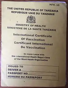 Proof of Yellow fever vaccination is required for all travellers travelling through or from the following countries: Angola, Argentina, Benin, Bolivia, Brazil, Burkina Faso, Burundi, Cameroon, Central African Republic, Chad, Colombia, Republic of the Congo, Democratic Republic of the Congo, Côte d'Ivoire, Ecuador, Equatorial Guinea, Ethiopia, French Guiana, Gabon, Gambia, Ghana, Guinea, Guinea-Bissau, Guyana, Kenya, Liberia, Mali, Mauritania, Niger, Nigeria, Panama, Paraguay, Peru, Rwanda, Senegal, Sierra Leone, South Sudan, Sudan, Suriname, Togo, Trinidad and Tobago, Uganda, Venezuela, Zambia.[15][16] The Tanzanian ministry of health mandates a transit time of more than 12 hours or a disembarkment from the immediate airport area from the above mentioned countries during transit as a possible health threat and requires travelers in such situations to possess Yellow Fever Certificates.[17]