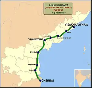 The 22801 / 02 Visakhapatnam–Chennai Central Superfast Express runs from Visakhapatnam via Duvvada, Anakapalle, Annavaram, Samalkot Junction, Rajahmundry, Tadepalligudem, Eluru, Vijayawada Junction, New Guntur, Tenali Junction, Ongole, Nellore, Gudur Junction and Sullurupeta to Chennai Central.[3] This train is maintained by East Coast Railway zone.