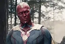 Prior to the introduction of Vision in the MCU, Paul Bettany had voiced J.A.R.V.I.S., Tony Stark's A.I. companion in previous films. Bettany admitted that he had little idea of what the role was, even as he recorded it, simply doing it as a favor for Jon Favreau.[5] He was cast again as the Vision,[6][7] an android created by Ultron.[8] Bettany stated that he was surprised when Whedon asked him if he wanted to be the Vision because once an actor has been cast as a particular character in the MCU, they usually are not cast as another.[9] On what intrigued him about the Vision, Bettany said, "The thing that appealed to me is that this sort of nascent creature being born, being both omnipotent and totally naive, the sort of danger of that and complex nature of a thing being born that is that powerful and that created in a second and the choices he makes morally are really complex and interesting. They've really managed to maintain all of that".[9] Bettany also stated that the Vision feels paternal and protective to a number of people in the film, particularly Wanda Maximoff, and has the ability to change his density. Bettany did wire work for the part.[9] Whedon stated he wanted to include the Vision in a second Avengers film before he signed onto the first film.[10] Vision's on-screen appearance was designed by Trent Claus and his team at Lola VFX, based on concepts by Ryan Meinerding.[11] Bettany's make-up, which consisted of a mix of face paint and prosthetics, took two hours to apply with make-up artists Jeremy Woodhead and Nik Williams citing the correct hue of the Vision's skin as the hardest thing to figure out.[12] Ultimately, however, the prosthetics and tracking dots were removed digitally and replaced with CG.[11]