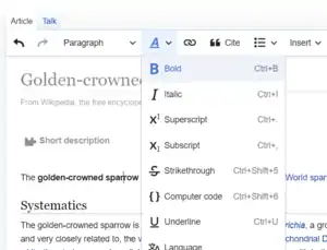VisualEditor (VE) is an online rich-text editor for MediaWiki-powered wikis that provides a direct visual way to edit pages based on the "what you see is what you get" principle. It was developed by the Wikimedia Foundation in partnership with Fandom.[2] In July 2013, it was enabled by default on several of the largest Wikipedia projects.[3][4]