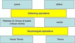 Let's consider that the pixels of an image, which are the smallest parts in a digital images (can not be divided into smaller ones), are like the letters of an alphabetical language. Then, a set of pixels in an image (patches or arrays of pixels) is a word. Each word can then be re-processed into a morphological system to extract a term related to that word. Then, several words can share a same meaning, each one will refer to the same term (like in any language). More than one words shared the same meaning and its belong to the same term (have same information). By this view, researchers can take advantage from text retrieval techniques to apply them to image retrieval system.