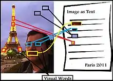 Visual words, as used in image retrieval systems,[1] refer to small parts of an image which carry some kind of information related to the features (such as the color, shape or texture), or changes occurring in the pixels such as the filtering, low-level feature descriptors (SIFT, SURF, ...etc.).