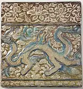 Geometric Islamic architectural decoration in stucco, tiling, brick and carved wood and stone became elaborate and refined, and along with textiles worn by the rich was probably the main type of art that could be seen by the whole population, with other types essentially restricted to the private spheres of the rich.[51] Carpets are recorded in several accounts of life at the time, but none remain; they were perhaps mainly a rural folk art at this period. Very highly decorated metalwork in copper alloys (brass or bronze) was produced, apparently for a sophisticated urban market. Gold and silver equivalents apparently existed but have been mostly recycled for their precious materials; the few survivals were mostly traded north for furs and then buried as grave goods in Siberia. Sasanid iconography of mounted heroes, hunting scenes, and seated rulers with attendants remained popular in pottery and metalwork, now often surrounded by elaborate geometrical and calligraphic decoration.[52] The rich silk textiles that were an important export from Persia also continued to use the animal, and sometimes human, figures of their Sasanid predecessors.[53]