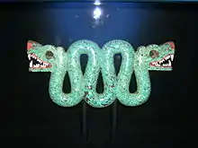 The pre-Hispanic art of Mexico belongs to a cultural region known as Mesoamerica, which roughly corresponds to central Mexico on into Central America,[3] encompassing three thousand years from 1500 BCE to 1500 CE generally divided into three eras: Pre Classic, Classic and Post Classic.[4] The first dominant Mesoamerican culture was that of the Olmecs, which peaked around 1200 BCE. The Olmecs originated much of what is associated with Mesoamerica, such as hieroglyphic writing, calendar, first advances in astronomy, monumental sculpture (Olmec heads) and jade work.[5]