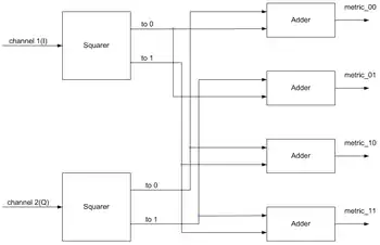 The squared norm () distance between the received and the actual symbols in the code alphabet may be further simplified into a linear sum/difference form, which makes it less computationally intensive.