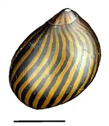 Native to brackish tidal waters such as mangrove swamps, this snail is also classified as Vittina turrita,[5] and is sold in the freshwater aquarium trade under the common name "tiger nerite" or "tiger snail."[6] Adults may thrive in fresh water with sufficient dissolved minerals. The species has separate male and female individuals; females lay eggs, which hatch into larvae that can survive only in brackish water. Adults grow to about 2.5 cm, and show a pale tan body with a darker tan shell, sometimes brownish or reddish, marked by black bands of varied width. The head has two short antennae which protrude from beneath the shell, each with a small eye at the base (generally invisible beneath the shell). Nerites are slow-moving snails that travel over rocks or hard substrates and do not burrow. Like other members of its genus, the species grazes on algae which it rasps from surfaces with its radula. It may opportunistically feed on other debris, but does not pursue animal food.[7] Because a variety of common names including "zebra nerite" can be used to refer to both species, it is sometimes confused with Neritina natalensis.