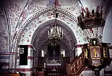 The pulpit is made in oak 1704–1705. It is decorated with various wood sculptures and gildings. The baptismal font is from the Middle Ages and made of sandstone. In the 17th century a grave chapel was built to the south for the members of the Barnekow family.[2]