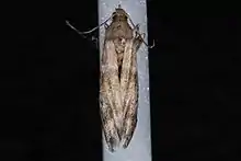 The wingspan is 14–16 mm. The forewings are pale brownish fuscous with a white-powdered area. The hindwings are pale fuscous and the veins and terminal margin are slightly darker.[2]
