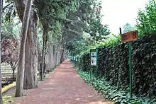 The park has an extension of 38.9 hectares,[2] located in the far west of the Coyoacán borough next to Ciudad Universitaria .[3] From its initial creation by Miguel Angel de Quevedo, the area has operated primarily as a tree nursery, growing seedlings for reforestation projects. The nursery operation produces about one million seedlings per year, which are mostly planted in and around Mexico City.[3][4] Most of the park’s area is planted with trees, and it is considered to be one of Mexico City’s “lungs.” Other areas are dedicated to seed beds, orchards and greenhouses.[3][5] The area used to be part of a ranch called Panzacola, and a few remains of this can still be seen such as the ruins of a small rectangular chapel and a well, with a date marking of November 18, 1918.[3]