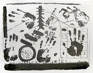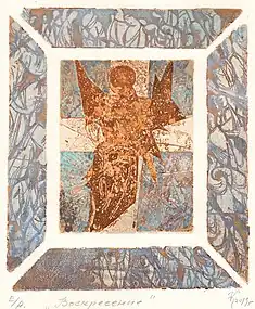 Over recent years, he has been occupied with private interior design, fresco wall painting, colour relief. The artist works in printed graphic technics: lithography, etching, serigraphy, and linocut.[2]