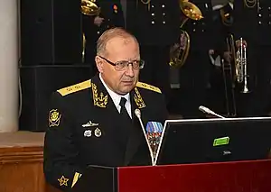 In April 2010 Kasatonov was appointed commander of the Kola Flotilla. In summer 2012 he commanded a detachment of ships from the Northern, Baltic and Black Sea Fleets, which operated in the Mediterranean Sea.[1] On 14 September 2012 he was appointed chief of staff and first deputy commander of the Pacific Fleet.[1][9][10] On 12 June 2013 he was promoted to vice-admiral.[2][9][11] On 3 October 2016 he was appointed head of the Naval Academy, taking over in a ceremony attended by his predecessor, Vice-Admiral Aleksandr Nosatov, and the Chief of Staff of the Navy Andrei Volozhinsky.[12] During the ceremony Volozhinsky described Kasatonov as "a true professional with a brilliant track record who has devoted many years to the service in the Northern and Pacific Fleets."[12] On 20 December 2018 Kasatonov successfully defended his thesis for the award of the doctorate of military science. Present at the defence were his uncle, Admiral Igor Kasatonov, and Colonel-General (Naval aviation) Vladimir Deineka.[13] In December 2019 Kasatonov was appointed deputy commander in chief of the navy.[14]