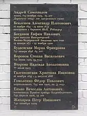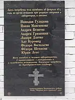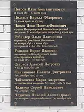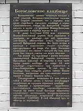 | Basic information about the Bogoslovskoe Cemetery (first board) | Noteworthy pre-revolutionary burials; compiled by Vladimir Ivanovich Saitov (second board) | List of pre-revolutionary burials; continued (third board) | List of pre-revolutionary burials; continued (fourth board) | The list of the dead on February 28, 1875, during the explosion in the artillery laboratory (fifth board) |