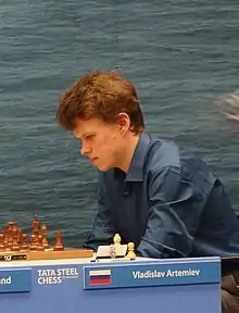 Vladislav Mikhailovich Artemiev (Russian: Владисла́в Миха́йлович Арте́мьев; born 5 March 1998) is a Russian chess grandmaster and former chess prodigy. He was awarded the title of Grandmaster in 2014. Artemiev is the 2019 European champion. He won the individual board performance gold medal as well as team gold medal at World Team Chess Championship 2019.[1] He participated in Chess World Cup 2015, 2017, 2019 and 2021 where he was knocked out in the round of 16 by Sergey Karjakin.