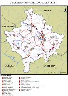 During Late Antiquity, the settlement was fortified with walls typical of the reconstruction of forts in the era of eastern Roman Emperor Justinian I as part of the defensive fortifications along the White Drin in late Dardania. The late antiquity fortifications are comparable to the material found in excavations at the site of the Prizren fortress and other settlements of the Prizren area (Karashëngjegj, Korishë, Vraniq).[2] The fortified area, covering about 2 hectares (4.9 acres), was probably used to observe the Via Lissus-Naissus (which bypassed the settlement). Archaeological finds indicate that it developed at the same site as an earlier non-fortified settlement in the 3rd to 2nd century BCE in the period of the Kingdom of Dardania.[7] Pottery fragments painted with geometric lines, a Starčevo flint knife, and anthropomorphic and zoomorphic figurines from the sixth millennium BC have been unearthed. A decorated baked-clay pot typical of the Vinča culture (third millennium BC), Bronze Age baked-clay table vessels and a 3.72-gram coin dating to 55 BC have also been found at the site.[8] To the north of the site stand the ruins of a medieval church. The patron saint of the church was St. Nicholas after whom to this day the locality is named (Shën Koll).[9]