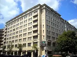 Koubek's D.C. area output slowed in the late 1960s. In February 1967, the Bureau of National Affairs (a privately held publisher of government news) commissioned him to design a six-story Modernist building at 1231 25th Street NW.[43] (This glass-and-white concrete neo-Brutalist building was stripped to its frame in 2007, four floors added, and joined to both an existing and a new structure to create luxury apartments.) In October 1967, construction began on his design for 1401 I Street NW, west of Franklin Square.[44] (The bland glass-and-steel box underwent a multimillion-dollar renovation in 1991. It was given a postmodern facade of finished grey concrete panels and brown granite, the center portion of the building on the south and east sides extended slightly outward to break up the flatness of the building, and twin giant six-story-high non-structural Doric columns topped by a non-structural colonnade and entablature. The building is now called Franklin Tower.)[45] In December 1967, Koubek designed a new home for the Motion Picture Association of America at 1601 I Street NW, described as a "bronze-tinted glass box on stilts enclosed by a bold screen of tan concrete".[46] Another critic later called it "elegant" and as good as the work of I. M. Pei.[47] Construction began in February 1968 on his building for One Dupont Circle NW, an eight-story office building with vertical concrete ribs over glass walls.[48]