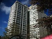 Several of Koubek's buildings for important clients began or completed construction in 1969. The Willoughby, at the time the largest apartment building in the D.C. metropolitan area, opened at 4515 Willard Avenue in Friendship Village, Maryland, in January.[54] Koubek assisted former First Lady Mamie Eisenhower and developer William Zeckendorf in breaking ground in February for the West Building (475 L'Enfant Plaza SW; now United States Postal Service headquarters), at 640,000 square feet (59,000 m2) the largest private office building at the time in Washington.[55][56] Eight months later, his headquarters at 1133 15th Street NW for Fannie Mae (the secondary mortgage market packaging corporation) opened.[57]