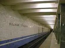 Vodny Stadion (Russian: Во́дный стадио́н, Water Stadium) is a Moscow Metro station on the Zamoskvoretskaya Line. It was built in 1964 according to the standard pillar-trispan design. The pillars are clad in bluish marble and the walls are tiled in white with two stripes of blue at the base. The two entrances to the station are located near the intersection of Kronshtadtsky Boulevard and the Golovinskoye highway. The architects for this station were N. Demchinsky, Yu. Kolesnikova, and M. Markovsky.