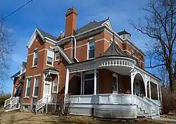 The Vogt House, also known as the Vogt-Unash House, is a historic building located in Iowa City, Iowa, United States. The two-story, brick structure is a fine example of vernacular Queen Anne architecture.[2] It follows an asymmetrical plan and features a high-pitched hipped roof, a gabled and a round dormer on the south elevation, a two-story gabled-roof pavilion on the east, a two-story polygonal bay with a hipped roof on the west, and a single-story addition on the back. Of particular merit is the wrap-around, latticework porch that has a round pavilion with a conical roof and finial on its southwest corner.[2] There are also two outbuildings: a two-story frame carriage house to the west of the house, and a woodshed to the north of the main house.