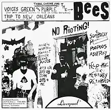 The Bees recorded "Voices Green and Purple" and released it as a single on the Liverpool label backed with "Trip to New Orleans" in October 1966.[1][2][3][4] "Voices Green and Purple" has been cited by rock historian Mike Stax as an influential example of "acid punk."[2] The song begins at a medium tempo, but then speeds up into a fast-paced thrash in the refrains. As Stax describes: "...when the song comes unglued the for the panic-stricken choruses, these guys were in uncharted waters."[2][4] According to music critic Richie Unterberger, "The psychedelic touch was added not just by the florid and deranged lyrics, but by the choruses, where the tune disappeared, the drums sped up, and the scrawling guitars made ascending shards of noise."[1] The single came wrapped in a paper jacket adorned with the kind of scrawled lettering and defaced imagery suggestive of later "D.I.Y." punk fanzines.[4][5] The Bees who recorded "Voices Green and Purple" are not to be confused with another band of the same name who were also active in the Los Angeles area at the time, who recorded on the Mira and Mirwood labels.[3]