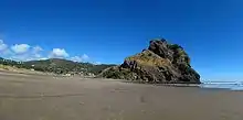 Earlier, during the Miocene, a mainly andesitic volcanic arc ran through Northland and neighbouring regions (including the Three Kings Ridge and northern Coromandel Peninsula), with western and eastern belts active between 25 and 15 million years ago and 23–11 million years ago respectively.[20] Although this produced substantial volcanic edifices, including New Zealand's largest known stratovolcano, the Waitakere volcano,[21] most of these have been eroded away, buried, or submerged, especially in the west, where a series of volcanoes buried offshore stretches south almost to New Plymouth. This is called the Northland-Mohakatino Volcanic Belt.[22] Remnants of these two ancient volcano belts are still exposed in many places, including Whangarei Heads, the Hen and Chickens Islands, around Whangaroa Harbour, Waipoua forest, and the Waitākere Ranges.