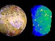 Volcanism on Io, a moon of Jupiter, is represented by the presence of volcanoes, volcanic pits and lava flows on the moon's surface. Its volcanic activity was discovered in 1979 by Voyager 1 imaging scientist Linda Morabito.[1] Observations of Io by passing spacecraft (the Voyagers, Galileo, Cassini, and New Horizons) and Earth-based astronomers have revealed more than 150 active volcanoes. Up to 400 such volcanoes are predicted to exist based on these observations.[2] Io's volcanism makes the satellite one of only four known currently volcanically active worlds in the Solar System (the other three being Earth, Saturn's moon Enceladus, and Neptune's moon Triton).