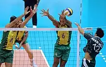 The majority of sprained ankles in volleyball occur when a player is at the net, either blocking or spiking.[3] The reason why ankle sprains occur at the net is because both blocking and spiking involve jumping and possibly of landing on an opponent's foot causing the injury. Approximately 50 percent of all sprained ankles in volleyball occur when a blocker lands on the attacking player's foot, while about 25 percent occur when a blocker lands on their own teammate's foot following a block with multiple blockers involved.[4]