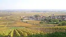 Vineyards around Volnay. Most of the vineyards in the image, those to the left of the village and immediately beyond it, are classified Premier Cru. In the far distance are some village-level vineyards.