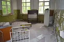 However, the high level of radioactivity soon began to affect Pravyk and the others. Working on roofs littered with highly radioactive debris ejected from the RBMK reactor by the explosion and inhaling radioactive smoke and other gasses exposed the firefighters to dangerously high amounts of radioactivity.[17] On the roof of Unit Three, where fragments of uranium dioxide fuel and graphite moderator were emitting up to three thousand roentgen per hour of gamma and neutron radiation, a fatal radiation dose of 500 rem could be received in a matter of minutes.[18] Experiencing early symptoms of Acute Radiation Syndrome (ARS), Pravyk and his men were forced to descend from the roof. Firefighters sent to assist them on the roof met them half-way down the fire-stairs, vomiting and unable to support themselves without one another's help.[17] Before his evacuation to Sanitary Unit No.126 (the Pripyat Hospital) at 2:25 AM, Pravyk asked those around him to contact his wife and tell her to close the windows in their apartment, so as to prevent radioactive contamination from entering.[19][1]