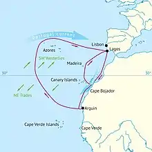 Volta do mar, volta do mar largo, or volta do largo (the phrase in Portuguese means literally 'turn of the sea' but also 'return from the sea') is a navigational technique perfected by Portuguese navigators during the Age of Discovery in the late fifteenth century, using the dependable phenomenon of the great permanent wind circle, the North Atlantic Gyre. This was a major step in the history of navigation, when an understanding of winds in the age of sail was crucial to success: the European sea empires would not have been established without an understanding of the trade winds.[1]
